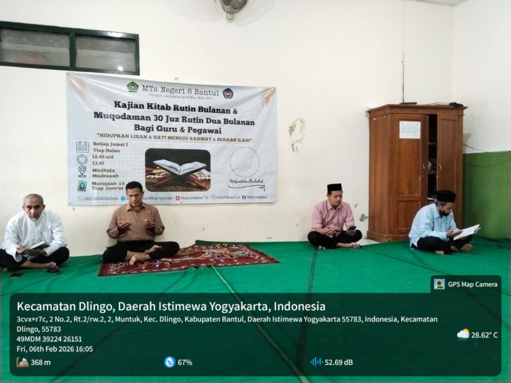 BANTUL (Matsadeba) – Memasuki pekan pertama di bulan Februari, guru dan pegawai MTsN 8 Bantul kembali memperkokoh spiritualitas melalui kegiatan rutin Muqodaman Al-Qur’an dan Kajian Kitab Nashoiqul ‘Ibad pada Jumat (06/02/2026). Agenda ini dilaksanakan dengan membagi peserta ke dalam 15 kelompok kecil yang bertugas menyelesaikan pembacaan Al-Qur’an mulai dari Juz 16 hingga 30 untuk bulan Februari dan 15 Juz awal di bulan Januari lalu. Melalui pembagian tugas yang teratur tersebut, keluarga besar madrasah berhasil menyelesaikan satu kali khataman sebagai wujud syukur dan upaya mencari rida Allah SWT.