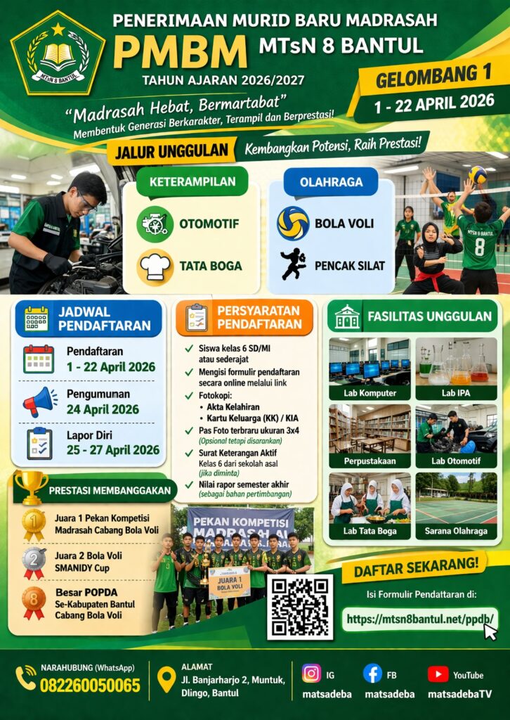 – Pada Tahun Ajaran 2026/2027 ini, MTsN 8 Bantul membuka PMBM dengan kuota 2 (dua) kelas