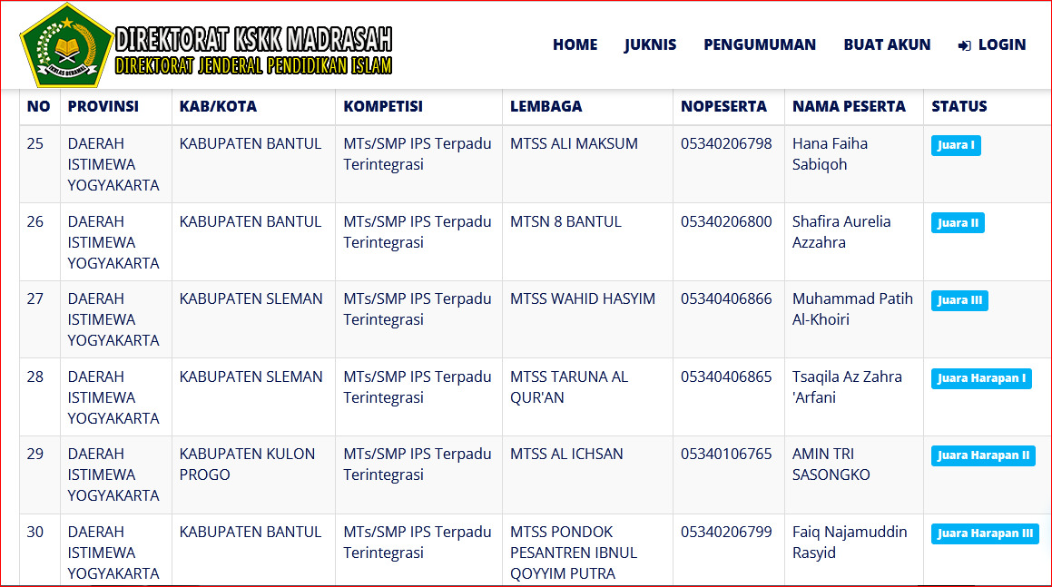 Shafira menempati posisi dibawah siswi MTs Ali Maksum Krapyak Bantul, Hana Faiha Sabiqoh. Selanjutnya juara 3 hingga harapan 3 adalah Muhammad Patih Al-Khoiri (MTs Wahid Hasyim Sleman), TsaqilaAz Zahra ‘Arfani (MTs Taruna Al Qur’an Sleman), Amin Tri Sasongko (MTs Al Ichsan Kulon Progo) dan Faiq Najamuddin Rasyid (MTs Ibnul Qoyyim Putra Bantul). Dengan demikian Shafira peraih juara 1 KSM tingkat Kabupaten harus merelakan Hana selaku peraih Juara 1 untuk mewakili DIY di ajang KSM tingkat Nasional yang akan digelar 23 – 24 oktober 2021 bersama 10 siswa lainnya yaitu peraih Juara 1 jenjang Madrasah Ibtidaiyah (MI)/SD mata pelajaran Matematika Terintegrasi dan Ilmu Pengetahuan Alam (IPA) Terintegrasi, jenjang Madrasah Tsanawiyah (MTs)/SMP mata pelajaran Matematika Terintegrasi, IPA Terintegrasi, dan jenjang Madrasah Aliyah (MA)/SMA/SMK mata pelajaran Matematika Terintegrasi, Biologi Terintegrasi, Fisika Terintegrasi , Kimia Terintegrasi, Ekonomi Terintegrasi, dan Geografi Terintegrasi.
